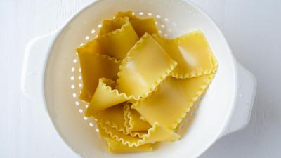 Preheat the oven to 350 F. Boil lasagna noodles, and then drain and rinse with cold water.